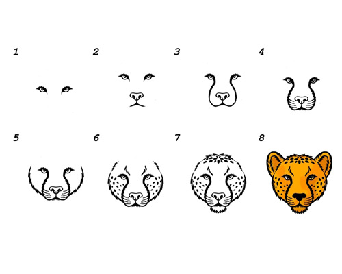حالا نوبت به جزئیات صورت پلنگ می‌رسد. دو دایره کوچک در بالای دایره اصلی رسم می‌کنیم که به عنوان گوش‌های پلنگ عمل می‌کنند. داخل این دایره‌ها باید دایره‌های کوچک‌تری کشیده شود تا حالت گوش‌های پلنگ مشخص‌تر شود. برای چشم‌های پلنگ، دو دایره کوچک در قسمت بالای دایره اصلی رسم می‌کنیم و داخل آن‌ها نقطه‌های کوچکی به عنوان مردمک چشم قرار می‌دهیم. بینی پلنگ را با یک مثلث کوچک در وسط دایره اصلی رسم می‌کنیم و دو خط منحنی از دو طرف بینی به سمت پایین می‌کشیم تا دهان پلنگ شکل بگیرد.منبع